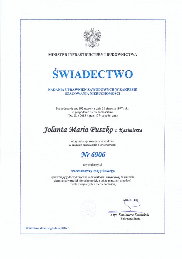 Uprawnienia zawodowe w zakresie szacowania nieruchomości nr 6906 nadane przez Ministra Infrastruktury i Budownictwa do wykonywania działalności zawodowej w zakresie określania wartości nieruchomości, a także maszyn i urządzeń trwale związanych z nieruchomością.